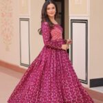 Elegant gown with position print choli and Jacquard weaving. Features a round neck, full sleeves, and 3 MTR flair. Available in 2 colors.